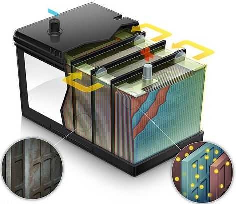 Устройство | Свинцовые пластины, покрытые активной массой (диоксид свинца и губчатый свинец), электролит (серная кислота), сепараторы | Кальций в составе пластин снижает газовыделение и саморазряд. |