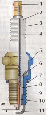 Основным элементом свечи зажигания является корпус (обозначен цифрой 5 на рисунке). Он имеет шестигранник для ключа (1) и резьбу, что позволяет установить устройство в головку блока цилиндров. Корпус защищен от коррозии специальным покрытием.