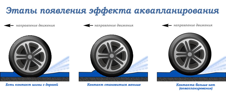 Когда глубина протектора становится меньше, покрышка хуже начинает отводить воду. В результат этого возникает аквапланирование – частичная или даже полная потеря сцепления с дорогой и, как результат, управления. Так как при увеличении износа шины поверхность ее соприкосновения с дорожным покрытием уменьшается, автомобилю сложнее тормозить даже на сухой поверхности. Все неприятности становятся еще заметнее при высокой скорости езды.