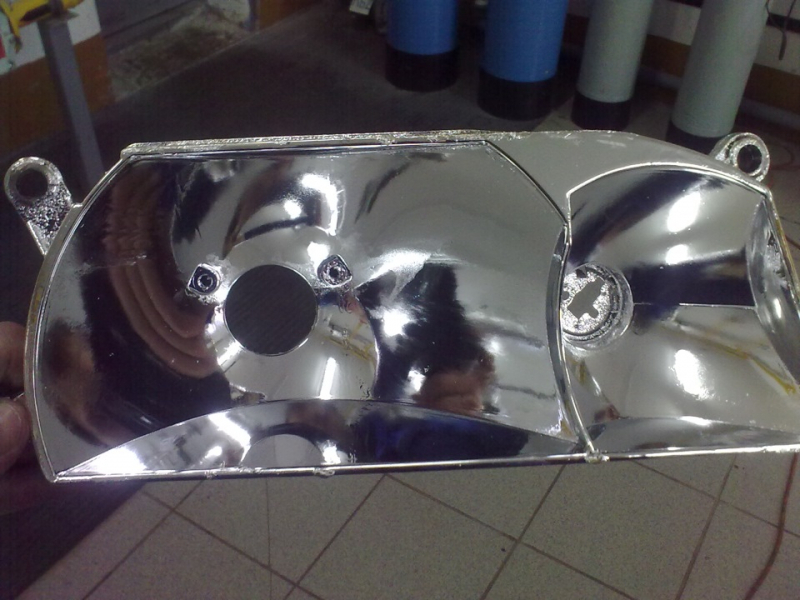 Отражатель и маску отделяют от других элементов. Старый слой хромированного покрытия полностью зашкуривается и снимается с помощью наждачной бумаги мелкой зернистости. После этого поверхность очищается от остатков краски и пыли, тщательно обезжиривается спиртовым или мыльным раствором.